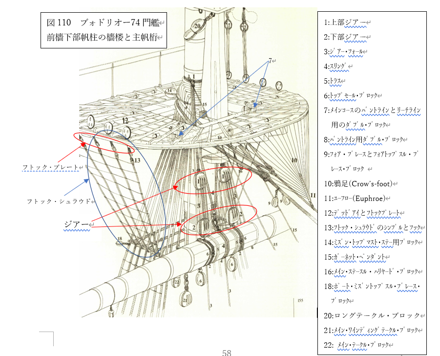 の説明を付随させ、其の他に多くの船に関する書物の挿絵を載せて翻訳を行いました。その例として、檣楼関連の挿絵を